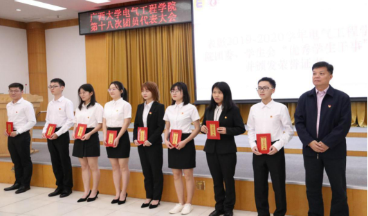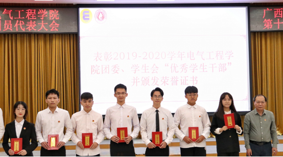 在等待统票结果的同时,主持人宣读了《2019-2020学年电气工程学院团委、学生会“优秀学生干事”表彰决定》及《2019-2020学年电气工程学院团委、学生会“优秀学生干部”表彰决定》。梁京章书记和梁志坚副书记为获奖代表颁发荣誉证书,并合影留念。