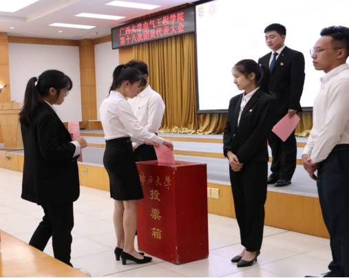 随后,会议分别审议并通过了《大会领导组织机构及名单》、《代表资格审查报告》、《选举办法》、《委员候选人考评、产生经过报告》。学生代表投票选举电气工程学院第十八届团委委员和第十九届学生委员会主席团成员。