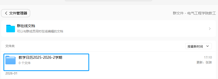 (1)命名格式:教学日历(2025-2026-2)+任课教师+课程名(与教务系统一致的全称)+(教学班)。上传到学院教工群文件夹:教学日历(2025-2026-2)。